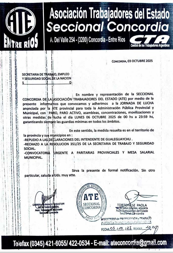 En la notificación del gremio, se lee que la convocatoria es en adhesión "a la JORNADA DE LUCHA anunciada por la ATE provincial para toda la Administración Pública Provincial y Municipal".
