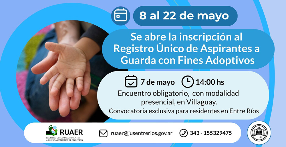 El 7 de mayo, a las 14, se llevará a cabo el encuentro obligatorio, con modalidad presencial, en Villaguay. La reunión es el primer paso para solicitar la inscripción en el Registro. Allí se brindará información relevante sobre el trámite a realizar y, en particular, se abordará la realidad de la adopción y sus implicancias.Quienes estén interesados/as en participar deben completar el siguiente formulario.