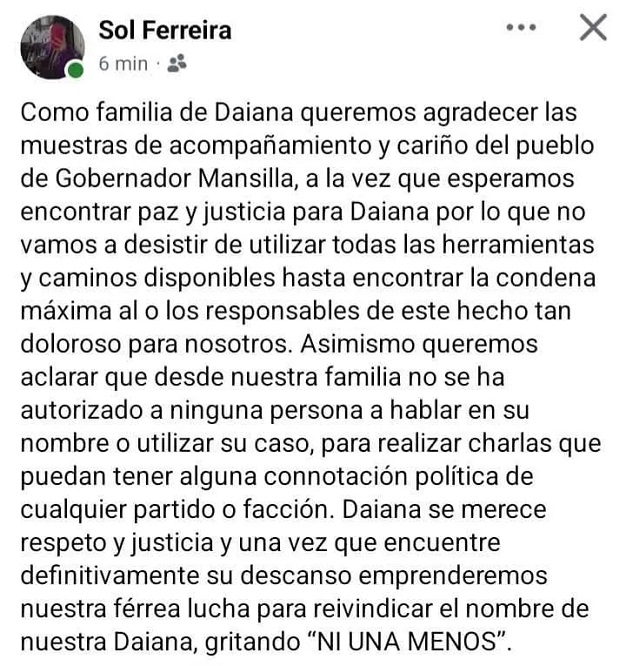 “Queremos comunicar que desde nuestra familia no se ha autorizado a ninguna persona a hablar en su nombre o utilizar su caso, para realizar charlas que puedan tener alguna connotación política de cualquier partido o facción”, expresó Sol Ferreira, en redes sociales. Asimismo, agradeció “las muestras de acompañamiento y cariño del pueblo”.