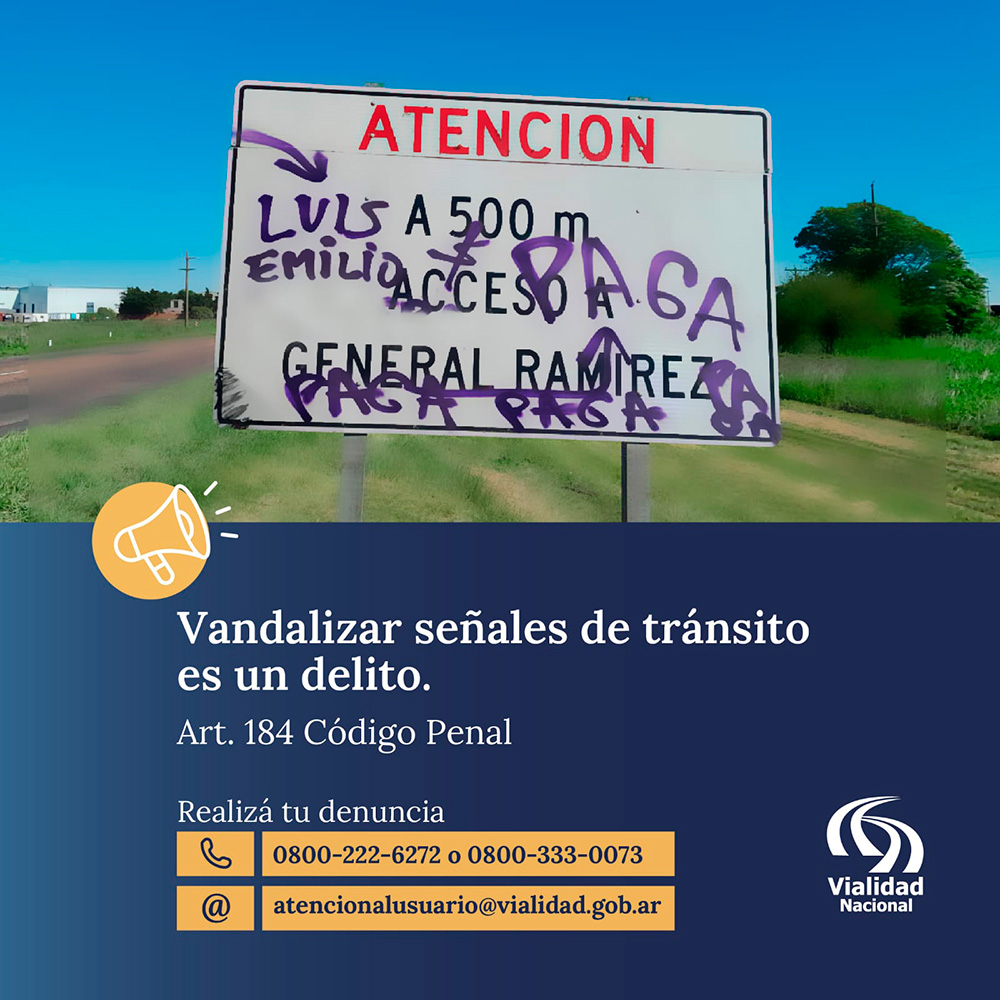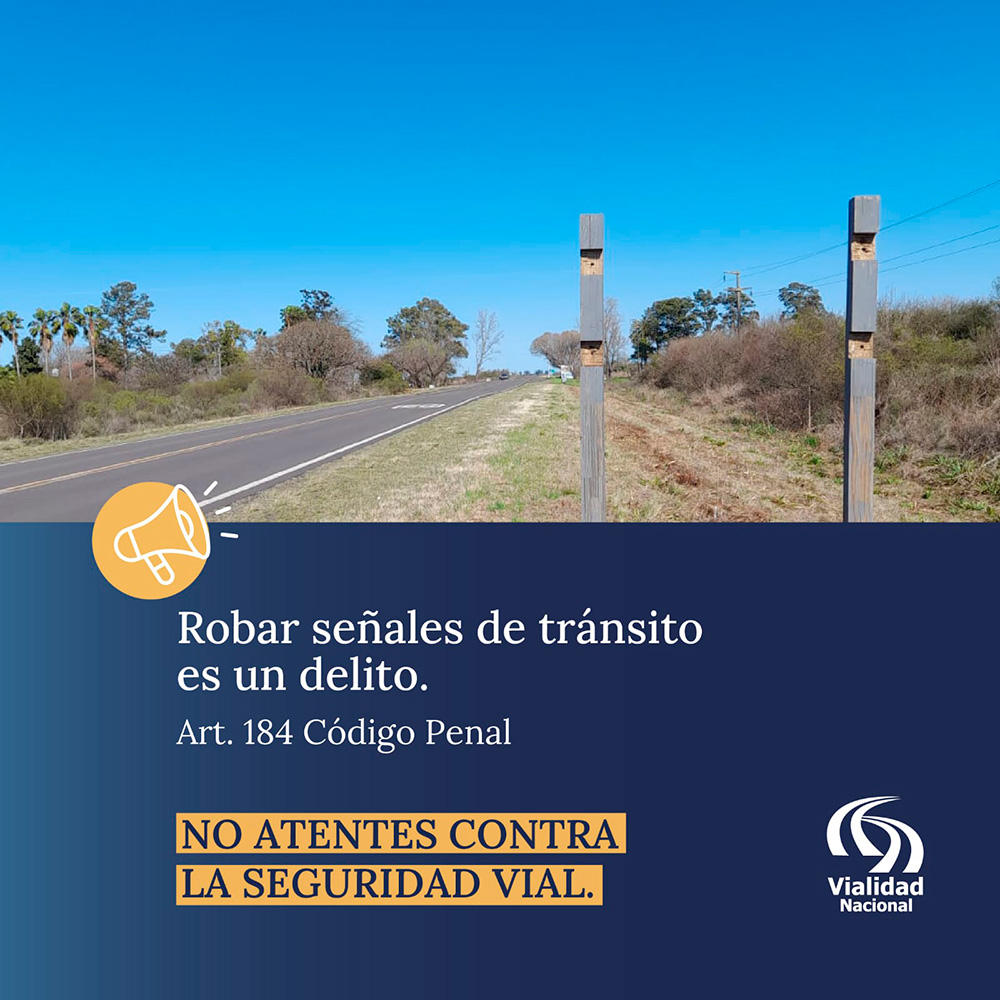 Ante estos reiterados y numerosos hechos, en el comunicado remitido a El Entre Ríos se recuerda que el hurto o daño de señales de tránsito constituye un delito tipificado en el artículo 184 del Código Penal Argentino, el cual atenta contra la seguridad vial y provoca un perjuicio económico al Estado.El señalamiento de las rutas es fundamental para brindar seguridad a quienes transitan, ya que su función es informar límites de velocidad, alertar sobre desvíos, así como anticipar las características de la vía a fines de evitar los siniestros viales y colaborar con una adecuada circulación del tránsito.