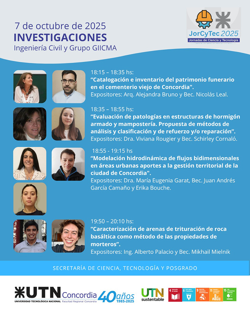 El 7 de octubre serán presentadas las investigaciones del de Ingeniería Civil y Grupo GIICMA que comenzará de 18:15 a 18:35 con la presentación de “Catalogación e inventario del patrimonio funerario en el cementerio viejo de Concordia”, cuyos expositores serán la arquitecta Alejandra Bruno y el becario Nicolás Leal.Luego, de 18:55 a 19:15 llegará el turno para “Modelación hidrodinámica de flujos bidimensionales en áreas urbanas aportes a la gestión territorial de la ciudad de Concordia”, que presentarán la doctora María Eugenia Garat, junto a los becarios Juan Andrés García Camaño y Erika Bouche.