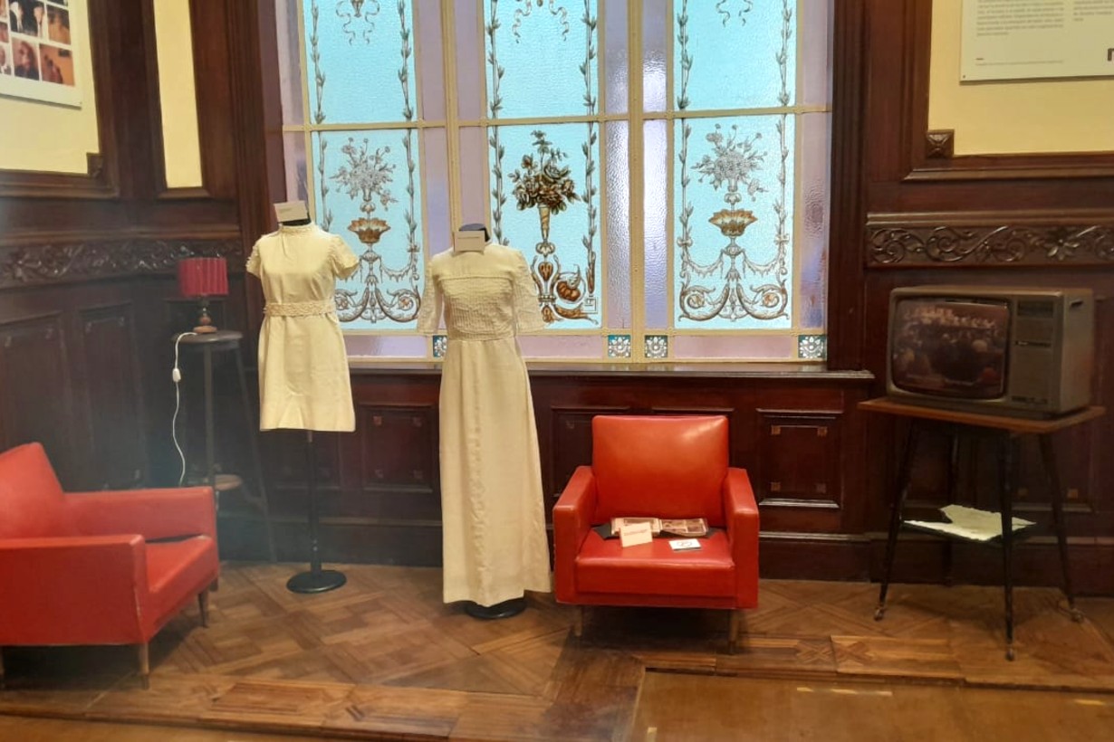 La escena recreada en la sala replica un hogar de época, con sillones rojos, una lámpara tenue, un televisor antiguo y pertenencias personales que permiten situar al visitante en un ambiente íntimo y cotidiano. En este contexto, los vestidos adquieren una dimensión significativa: no son únicamente prendas, son fragmentos de una vida interrumpida.