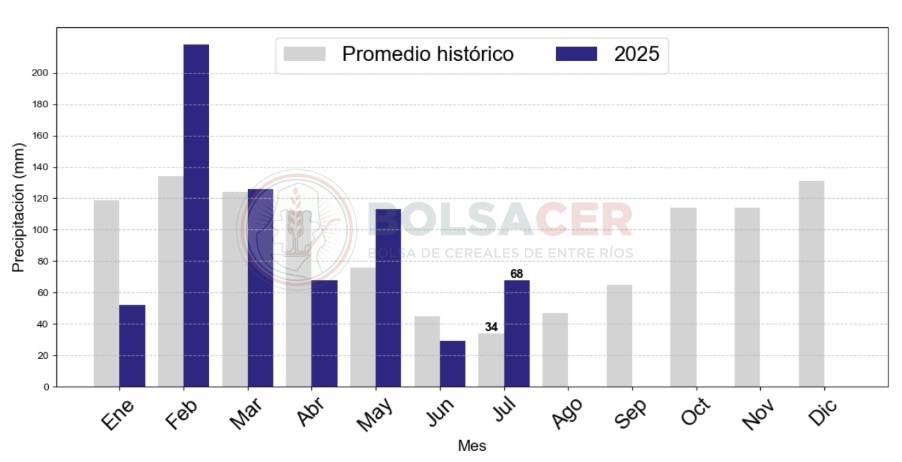 El promedio provincial de lluvias fue de 68 mm, lo que representa un aumento del 100 por ciento respecto al promedio histórico para el mes, que es de 34 mm. Este considerable incremento se traduce en una diferencia absoluta de 34 mm sobre la referencia histórica.