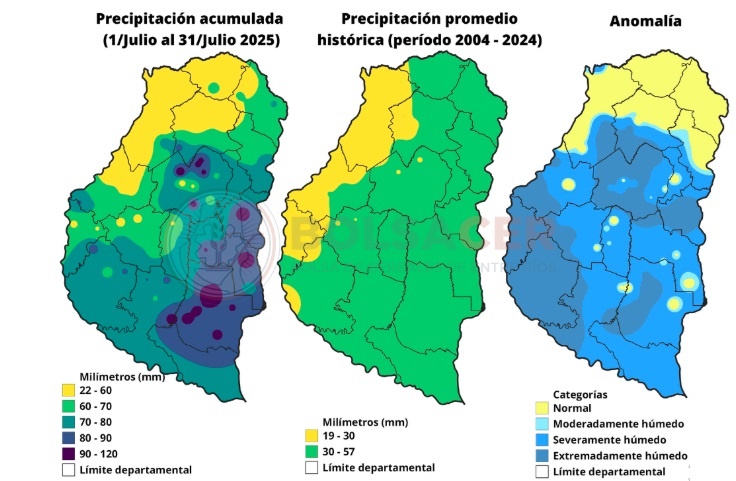 En conclusión, julio de 2025 se caracterizó por precipitaciones considerablemente superiores al promedio histórico, mostrando un escenario predominantemente húmedo en la provincia, especialmente en las regiones sur y sureste.