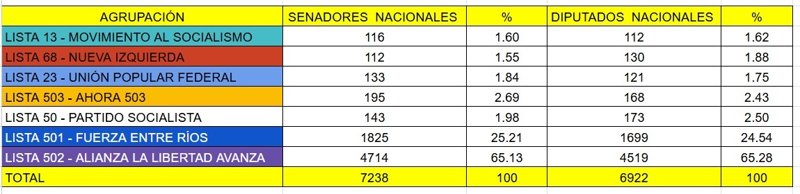 De acuerdo con los datos proporcionados a El Entre Ríos desde el comité de la UCR, el espacio libertario y de Juntos por Entre Ríos cosechó 4.714 sufragios para senadores y 6.922 para diputados, consolidándose como la principal fuerza política en la ciudad.