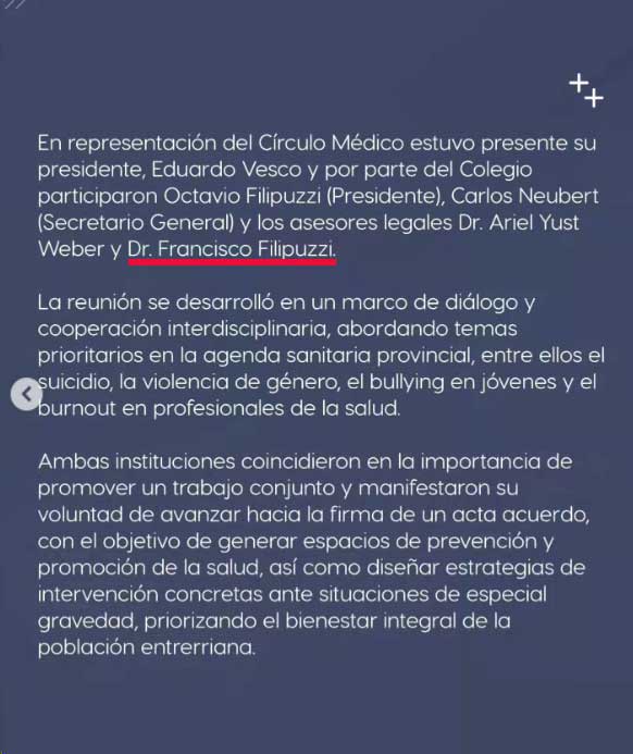 No hizo falta que transcurriera siquiera un mes de la gestión de Octavio Filipuzzi para que una información del Colegio de Psicólogos diera cuenta de que otra persona con el mismo apellido había sido incorporada como asesor legal. ¿De quién se trata? De Francisco Filipuzzi, quien no solo es hijo del rector Luciano y, por ende, sobrino del psicólogo Octavio. También ejerce como Secretario General de la UADER, donde su padre ocupa la rectoría.